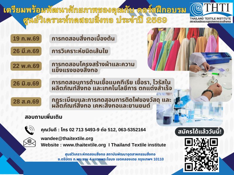 Textile Testing Centre (TTC),a division of Thailand Textile Institute (THTI), established in 1999 to serve the manufacturers and exporters of textiles & garments in Thailand. The laboratory has an international recognition for its accuracy & reliability of quality assessments, and is widely known as a one-stop centre that offers full cycle of services, ranging from textile materials tests, quality assurance, research for product innovations & developments, consultation, special training and workshops etc.