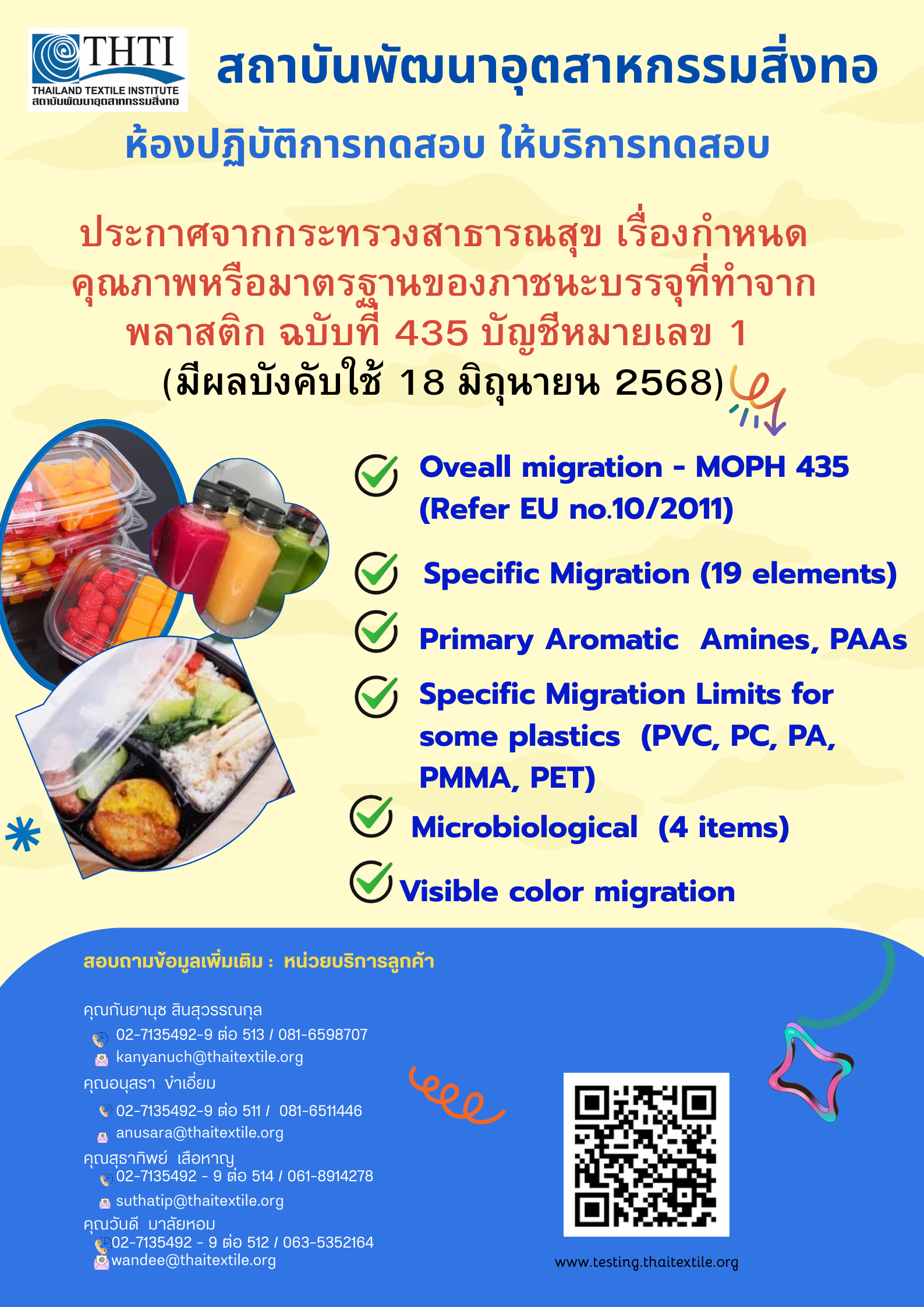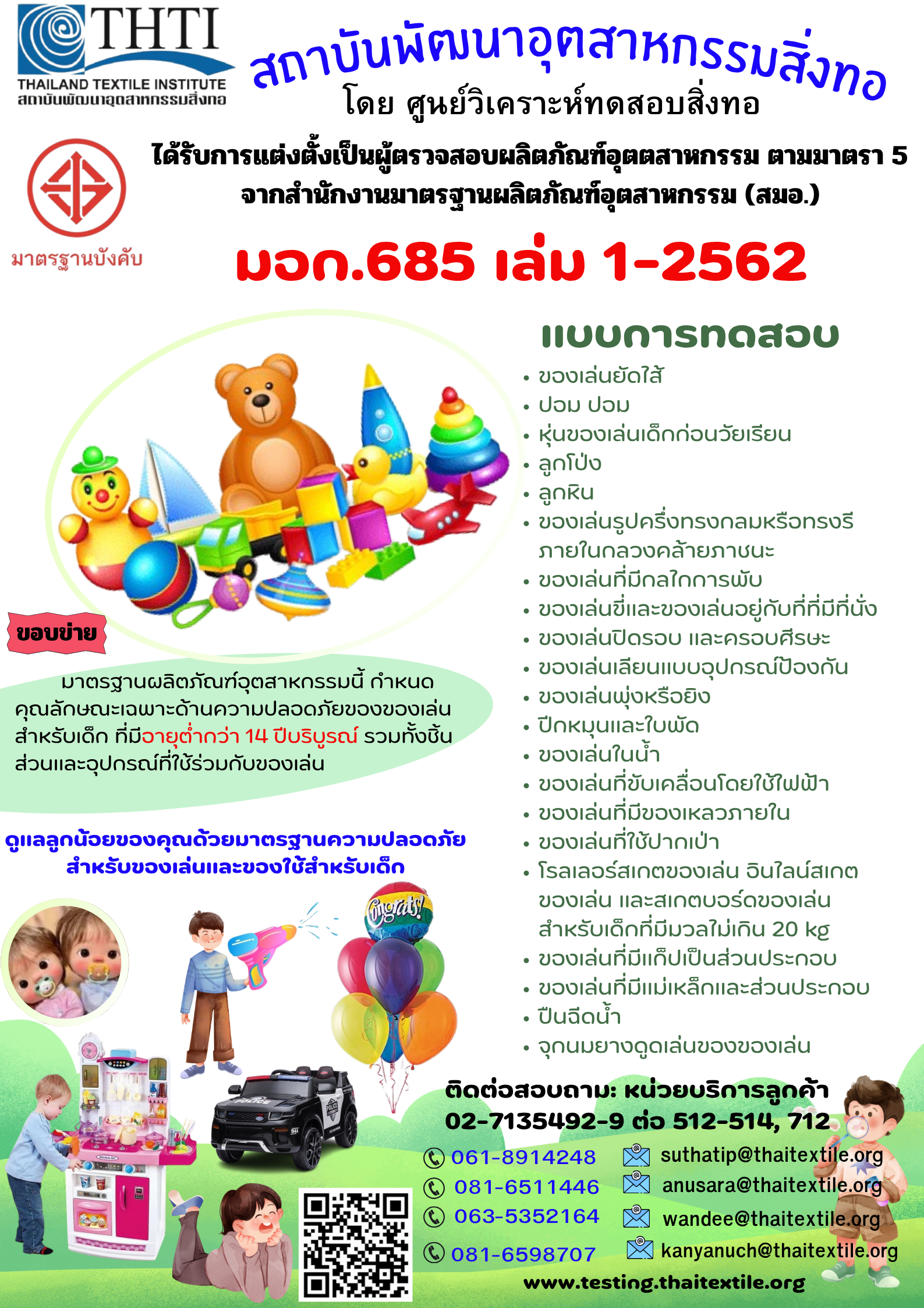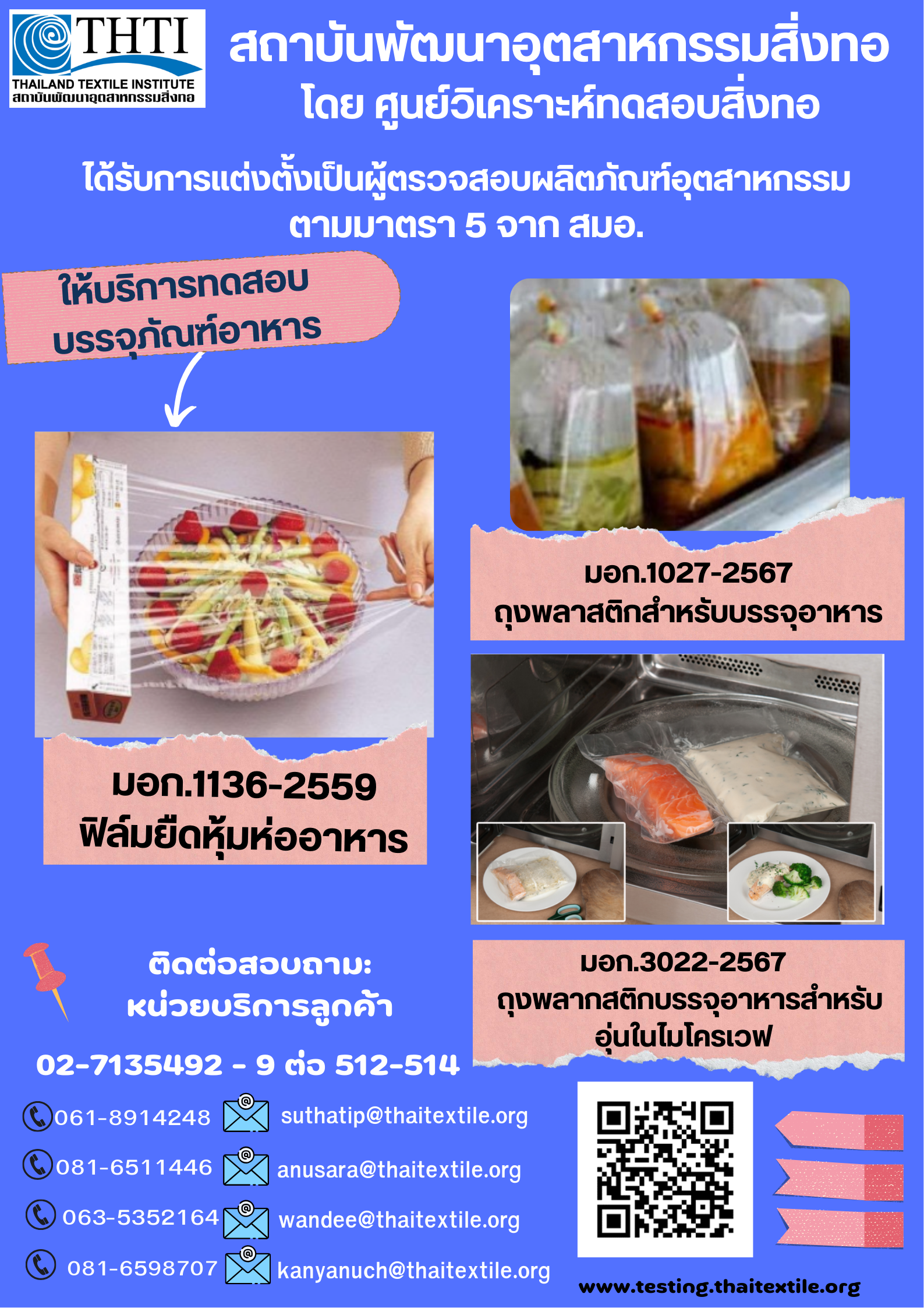 เพราะเรามุ่งมั่นทำงานเพื่อผู้ประกอบการด้านสิ่งทอและเครื่องนุ่งห่มไทย จึงพร้อมให้บริการวิเคราะห์ทดสอบคุณภาพ ตั้งแต่ต้นน้ำจนถึงปลายน้ำ โดยบุคคลากรที่มีความเชี่ยวชาญเฉพาะด้าน ด้วยห้องทดสอบที่มีเครื่องมือทันสมัย ทั้งวัสดุสิ่งทอ และสินค้าสำเร็จรูป สินค้าที่เป็นมิตรต่อสิ่งแวดล้อม การย่อยสลายได้ของวัสดุ รวมถึงสินค้าจากอุตสาหกรรมที่เกี่ยวข้อง ในทุกมาตรฐานสินค้า ทั้งมาตรฐานสากล มาตรฐานโรงงาน หรือตามมาตรฐานผู้ซื้อผู้ขาย ทั้งเพื่อจำหน่ายภายในประเทศและส่งออก
